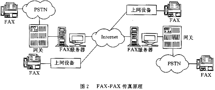 發(fā)送端傳真機與網關連接,通過PSTN傳送傳真,網關接收傳真后通過Internet傳至另一端的網關,另一端的網關再通過PSTN將傳真發(fā)送給接收端傳真機。這種方式既適合存儲轉發(fā)模式,也適合實時模式,因此更加有吸引力。近年來,出現了一種不依賴網關的FAX-FAX IP傳真技術,它是利用傳真機外掛一專用上網設備直接在Internet網上發(fā)送信息,原理如圖2所示。