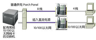 第二種方式是,在局域網(wǎng)交換機(jī)和電話機(jī)之間增加一個(gè)專用供電設(shè)備,一邊是多路普通網(wǎng)絡(luò)線從局域網(wǎng)交換機(jī)接入,另一邊則是增加了供電的多路網(wǎng)絡(luò)線,接出到IP電話機(jī)。這種設(shè)備一般安置在機(jī)房,只是增加了機(jī)房內(nèi)的網(wǎng)線排列。如下圖: