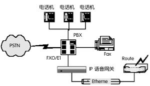 在這種應(yīng)用方式中, IP語音網(wǎng)關(guān)采用FXO接口與PBX(用戶電話交換機(jī))互連,電話直接接入PBX,未接入PBX的外部電話,經(jīng)電話公網(wǎng)(PSTN)與PBX相連。