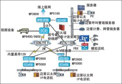 邁普IP語(yǔ)音解決方案采用了邁普MyPower VG2000IP語(yǔ)音網(wǎng)關(guān)和邁普以太網(wǎng)IP電話進(jìn)行改造。在整個(gè)網(wǎng)點(diǎn)語(yǔ)音終端全部設(shè)備選用經(jīng)濟(jì)型邁普以太網(wǎng)IP電話機(jī)。它采用雙以太口設(shè)計(jì),使網(wǎng)絡(luò)無(wú)需重新布線,同時(shí)也可使用已有的路由器上IP語(yǔ)音模塊。邁普以太網(wǎng)IP電話機(jī)之間的話音通信通過(guò)邁普呼叫管理服務(wù)器集中控制。在主體IP網(wǎng)絡(luò)中,邁普IP語(yǔ)音網(wǎng)關(guān)放置于中心機(jī)房作為傳統(tǒng)PSTN的出口,可以通過(guò)VOS接口、E1接口、E&M接口等多種方式接入公安PBX,將PSTN線路傳來(lái)的時(shí)分話音或傳真信息進(jìn)行分組和壓縮,轉(zhuǎn)換成IP數(shù)據(jù)包,通過(guò)路由設(shè)備路由到目的地。在沒(méi)有PBX的公安機(jī)房,邁普IP語(yǔ)音網(wǎng)關(guān)可以提供32路的模擬用戶接口,可以完全替代傳統(tǒng)PBX,接入PSTN,并提供額外功能。