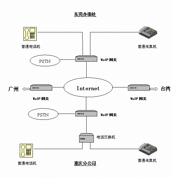 有一家臺商公司,在臺灣、東莞、廣州和重慶自己的分支機構(gòu),相互之間有大量的通話聯(lián)系,特別是研發(fā)部門,其通話量更是非常大。因此試圖在各個地方之間使用IP電話來降低通訊支出。在實施IP電話服務(wù)之前,各個地方都擁有完善的局域網(wǎng),并且申請了固定IP的寬帶接入。并且在辦公室內(nèi)部署了程控電話交換機。
