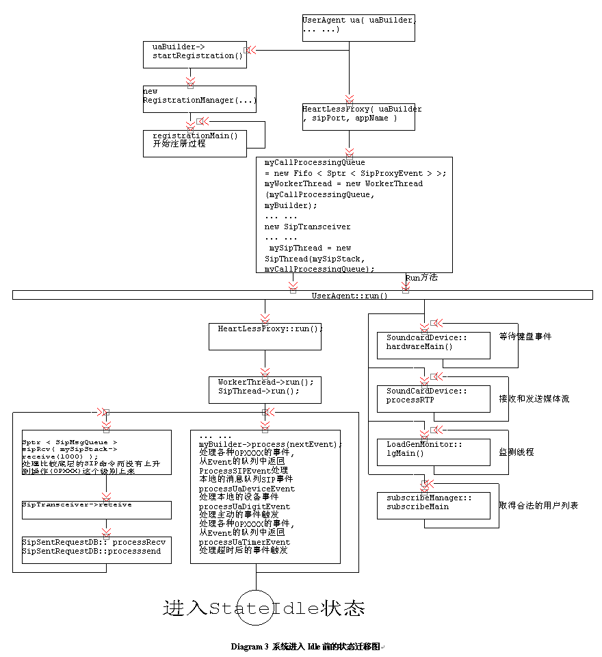 構(gòu)建User Agent的工作已經(jīng)完畢,現(xiàn)在應(yīng)該讓調(diào)用它的Run方法了;從下面的程序可以看到,Run方法的調(diào)用,讓整個(gè)程序進(jìn)入一種"Idle"的狀態(tài),等待命令輸入和狀態(tài)的產(chǎn)生,這個(gè)過(guò)程我們可以看到在Ua.CXX的Main程序中調(diào)用(ua.run())。
