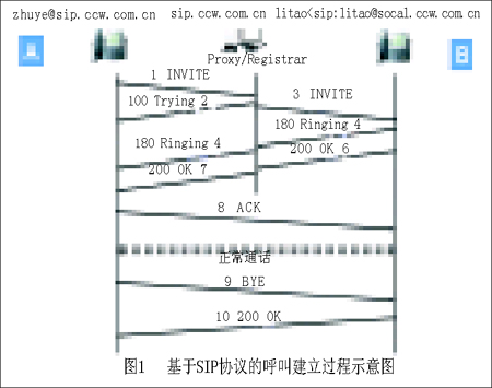 在Windows中內(nèi)置的NetMeeting就是典型的H.323協(xié)議客戶端,而比較常見的SIP系統(tǒng)是微軟開發(fā)的MSN Messenger系統(tǒng)。一個簡單的SIP協(xié)議呼叫建立過程如圖1所示。