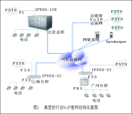 我國現(xiàn)有很多擁有自己專網(wǎng)的行業(yè),比如金融、能源和一些政府機(jī)構(gòu),它們正是通過這樣的方案來實現(xiàn)內(nèi)部通話的。這些行業(yè)目前也正是中國VoIP市場的主力,由于行業(yè)用戶的規(guī)模很大,目前中國的很多行業(yè)實際上都有一套運(yùn)營級的VoIP網(wǎng)絡(luò)。圖3是一個典型的行業(yè)VoIP組網(wǎng)結(jié)構(gòu)圖。