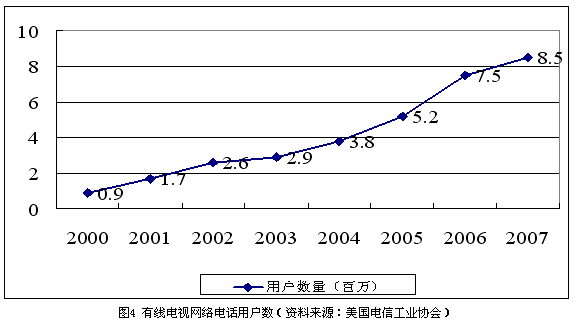 隨著有線電視用戶數(shù)量逐漸達(dá)到飽和,有線電視公司也在積極尋找新的利潤(rùn)增長(zhǎng)點(diǎn)。在過去的7年中,有線電視公司投入了高達(dá)800億美元的資金用于網(wǎng)絡(luò)升級(jí)改造,現(xiàn)在,大部分有線電視網(wǎng)絡(luò)已經(jīng)可以提供包括寬帶接入、本地和長(zhǎng)途電話、數(shù)字電視、視頻點(diǎn)播等在內(nèi)的一攬子服務(wù)。到2004年末,有線電視公司已經(jīng)擁有超過380萬的本地電話用戶。根據(jù)美國(guó)電信工業(yè)協(xié)會(huì)的估算,到2007年,全美將會(huì)有超過800萬的用戶選擇基于有線電視網(wǎng)的基本電信業(yè)務(wù),如圖4所示。