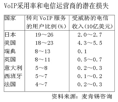 新興的寬帶運營商紛紛推出寬帶電話業(yè)務,對傳統(tǒng)電信運營商的話音業(yè)務構(gòu)成了嚴重威脅。如:美國的AOL、Seednet等互聯(lián)網(wǎng)服務提供商和MSN、Yahoo等網(wǎng)絡內(nèi)容提供商等都借助VoIP積極進入話音服務市場。