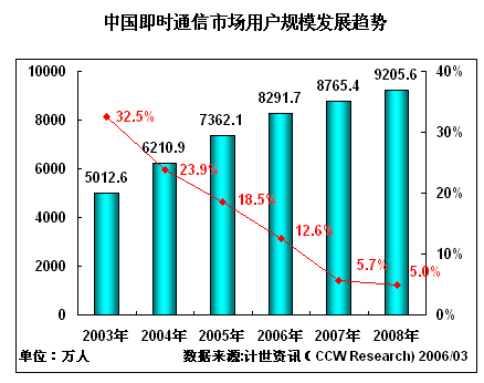 即時(shí)通訊巨大的市場價(jià)值主要來自三方面,除了能夠增加門戶網(wǎng)站的用戶的黏性,即時(shí)通訊能夠帶來巨大的用戶和網(wǎng)絡(luò)通訊巨大的市場。根據(jù)計(jì)世資訊《2005-2006年中國VoIP業(yè)務(wù)發(fā)展趨勢研究報(bào)告》相關(guān)數(shù)據(jù)顯示,2005年中國即時(shí)通訊用戶達(dá)到7362.1萬人,增長率為18.5%,2005年中國即時(shí)通訊市場規(guī)模達(dá)到16.2億元,實(shí)現(xiàn)37.3%的增長率。