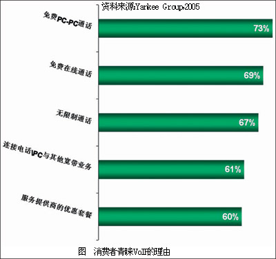 市場調(diào)研咨詢公司Yankee Group日前針對消費者進(jìn)行了一次調(diào)查,結(jié)果顯示:73%的用戶喜歡VoIP是因為通過它可以進(jìn)行免費的PC對PC通話;69%的用戶喜歡VoIP在線呼叫的功能;67%的用戶表示,VoIP廉價的通話費用使人們可以無限制地通話,令人心動;61%的用戶表示,喜歡通過VoIP使電話與PC、其他在寬帶網(wǎng)絡(luò)上的一些活動捆綁起來;60%的用戶表示被服務(wù)提供商提供的優(yōu)惠套餐吸引。對于用戶來說,VoIP最大的吸引力似乎在于其低廉的話費和為人們帶來的方便。