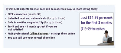BTBroadbandTalk產(chǎn)品在其套餐使用費(fèi)中包括了一定時(shí)段的免費(fèi)國(guó)內(nèi)時(shí)長(zhǎng),國(guó)際長(zhǎng)途按照通話量另外收取。VoIP通話所需要的寬帶電話設(shè)備由BT免費(fèi)提供給客戶。