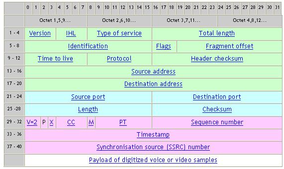 根據(jù)IETF的標準建議,通過IP網(wǎng)絡傳輸語音信號樣本需要增加三個額外的報頭,每個報頭對應一個網(wǎng)絡層次,即IP,UDP和RTP [4]。
