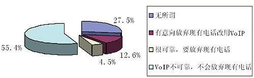 最近《華爾街日報》刊載了YankeeGroup公司的調(diào)查報告,對美國人使用VoIP的趨向和目前的一些應(yīng)用狀況進行了統(tǒng)計,重點調(diào)查了美國人是否要放棄傳統(tǒng)的固定電話而改用VoIP,具體數(shù)據(jù)參見圖1。從圖中可見人們對放棄固定電話而改用VoIP的意向還不是很高,但已使用VoIP的人群卻是個龐大的群體,使用VoIP的人口比例已達15.1%,現(xiàn)使用人數(shù)已達到了4500多萬戶,具體見表1。另外,目前美國VoIP已從暴利行業(yè)轉(zhuǎn)向微利行業(yè),這點可以從Skype公司收入得到證明,詳見表2。
