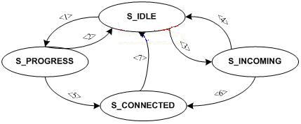 “S_IDLE”狀態(tài)就是我們通常所說(shuō)的待機(jī)狀態(tài)。當(dāng)用戶撥打?qū)Ψ降腟IPURI,協(xié)議棧通過(guò)發(fā)送INVITE請(qǐng)求消息,得到臨時(shí)響應(yīng)消息,呼叫就處于“S_PROGRESS”,圖中箭頭<1>表示該操作引起的狀態(tài)切換。在“S_PROGRESS”狀態(tài),對(duì)方如果拒絕接受呼叫,狀態(tài)又返回“S_IDLE”,如箭頭<2>;當(dāng)對(duì)方接受呼叫,就處于連接通話狀態(tài)“S_CONNECTED”,如箭頭<5>。在“S_IDLE”狀態(tài)也可能收到對(duì)方的呼叫請(qǐng)求,當(dāng)UA應(yīng)用發(fā)現(xiàn)一個(gè)新的呼叫請(qǐng)求,就應(yīng)當(dāng)切換狀態(tài)到“S_INCOMING”,如箭頭<3>;同樣,用戶可以拒絕接受呼叫,狀態(tài)切換回“S_IDLE”,如箭頭<4>;當(dāng)用戶接受呼叫請(qǐng)求,呼叫狀態(tài)就處于“S_CONNECTED”。在“S_CONNECTED”狀態(tài),通話雙方任何一方的結(jié)束通話請(qǐng)求都會(huì)導(dǎo)致?tīng)顟B(tài)返回“S_IDLE”,結(jié)束通話。