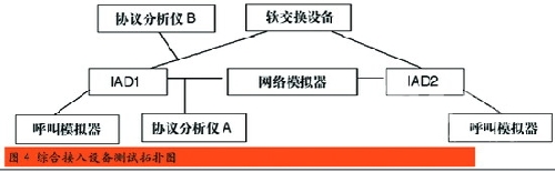 我國通信行業(yè)國家標(biāo)準(zhǔn)《基于軟交換的綜合接入設(shè)備測試方法》中明確了IAD設(shè)備九個(gè)大項(xiàng)的測試,分別是基本功能測試、協(xié)議測試、接口測試、話音業(yè)務(wù)測試、數(shù)據(jù)業(yè)務(wù)測試、性能測試、OAM測試、硬件項(xiàng)目測試和環(huán)境測試。按照圖4所示的測試拓?fù)鋱D進(jìn)行連接,就可以按照測試方法中的測項(xiàng)要求,逐一得出測試結(jié)果。