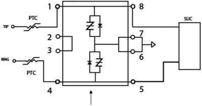 FXS要求SLIC保護(hù)器能夠?qū)⒍嘤嗟睦擞哭D(zhuǎn)移到SLIC T/R線(xiàn)路中。這是利用P1101DF-1的單向特性完成的。線(xiàn)路中出現(xiàn)的正浪涌將被反并聯(lián)二極管轉(zhuǎn)移到SIDACtor