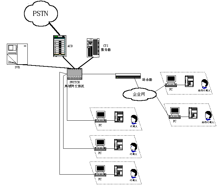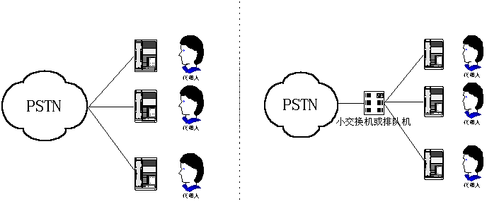 呼叫中心,早期是指一個由兩人或更多人組成的、在一個特定地方用專用設備處理電話業(yè)務的小組。這些人就是通常所說的呼叫中心代理(人)。一個呼叫中心可以只提供信息接收服務,或者只提供信息發(fā)送服務,或者是一個混合式呼叫中心,其呼叫中心代理會負責所有這兩項工作。從物理設備構成來看,第一代呼叫中心可用下圖(1)、(2)表示。