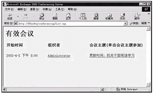 如果在前面已設(shè)置了提醒功能,那么在臨近會議前屏幕上將出現(xiàn)提醒窗口。教師機(jī)和學(xué)生機(jī)有三種方法可以參加會議:點(diǎn)擊提醒窗口中[參加會議]按鈕;或者不等提醒,直接點(diǎn)擊會議邀請函中的鏈接打開會議網(wǎng)頁;最好的方式還是打開IE,輸入網(wǎng)址http://x/conferencing/list.asp進(jìn)入會議(x為Exchange服務(wù)器的IP地址或計算機(jī)名),如圖3。