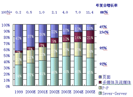 同時(shí),人們對(duì)P-P的互動(dòng)及多媒體的傳輸?shù)男枨髮⒊蔀榫W(wǎng)絡(luò)使用的2個(gè)最主要的發(fā)展趨勢(shì)。據(jù)麥肯錫公司和JP摩根的分析和預(yù)測(cè),多媒體及流媒體的IP流量將以每年154%的復(fù)合率增長,而P-P的IP流量將以95%的年復(fù)合增長率增長,這2項(xiàng)將成為用戶需求增長最快的業(yè)務(wù)。如下圖,