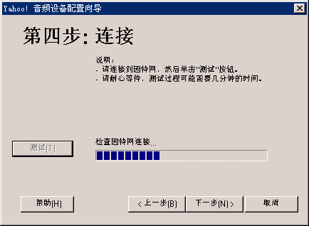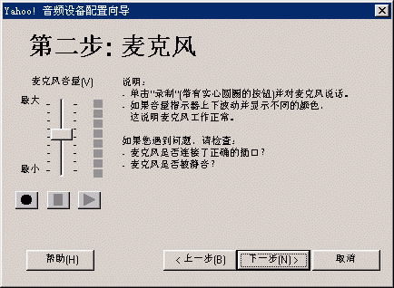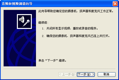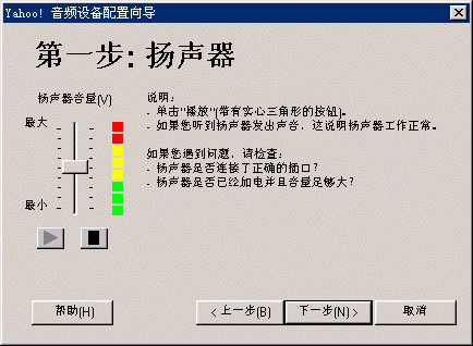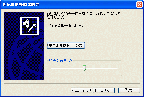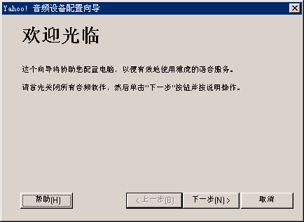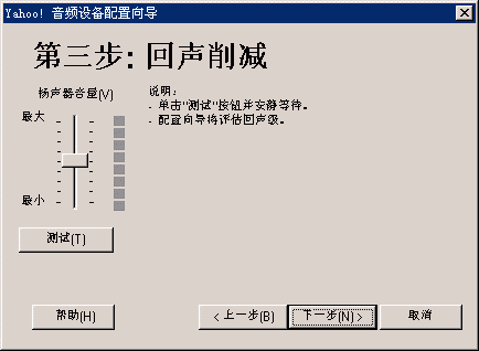 選擇幫助->音頻設(shè)備配置向?qū)?圖2),會(huì)彈出“音頻設(shè)備配置向?qū)А贝翱?圖3),這個(gè)向?qū)?huì)幫助你對(duì)揚(yáng)聲器、麥克風(fēng)、回音、網(wǎng)絡(luò)連接等項(xiàng)目進(jìn)行標(biāo)準(zhǔn)的測(cè)試和設(shè)置。