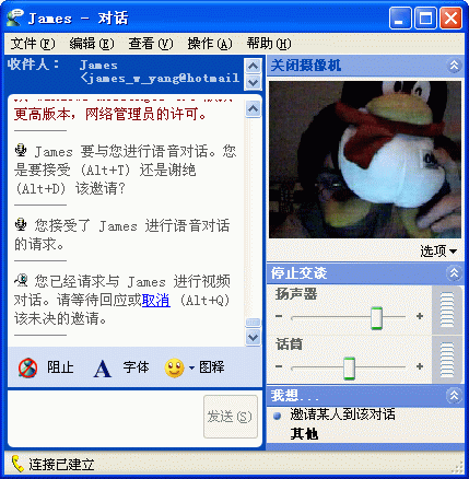 單擊對(duì)話框右邊的“啟動(dòng)攝像機(jī)”和“開(kāi)始交談”,系統(tǒng)會(huì)提示你正在等待對(duì)方回應(yīng)視頻或語(yǔ)音對(duì)話的邀請(qǐng),對(duì)方接受,就開(kāi)始進(jìn)行視頻通話(見(jiàn)圖11)。如果雙方都有攝像頭,你還可以通過(guò)視頻框下面的“選項(xiàng)”將自己的影像設(shè)為畫(huà)中畫(huà)的功能。