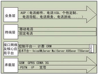 企業(yè)利用語音門戶,可以通過節(jié)省人工座席成本實現(xiàn)低成本地發(fā)布信息,提供客戶服務(wù),而且可以實現(xiàn)其它有價值的業(yè)務(wù),開創(chuàng)新的市場空間和利潤,其業(yè)務(wù)系統(tǒng)層次如圖2所示。