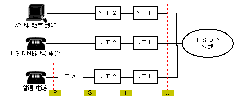 TA:終端適配器,完成非標(biāo)準(zhǔn)設(shè)備到ISDN速率的匹配及協(xié)議轉(zhuǎn)換(它可以在TE2中內(nèi)嵌實(shí)現(xiàn));以上各類設(shè)備間的連接接口稱為參考點(diǎn)(見下圖):