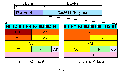 ATM信元實際上就是分組,為區(qū)分X.25分組(Packet)改稱為信元(Cell)。ATM信元具有固定的長度,總長為53字節(jié)。其中前5個字節(jié)為信頭(Header),包含各種控制信息,包括信元目的(邏輯)地址、糾錯碼、業(yè)務控制和維護信息等;后面48字節(jié)為信息字段(Payload),又稱凈荷,其中包含了業(yè)務的數據,它們將被透明地傳輸。信元結構如下圖6所示。在UNI接口和NNI接口上ATM的信元頭結構是不同的。