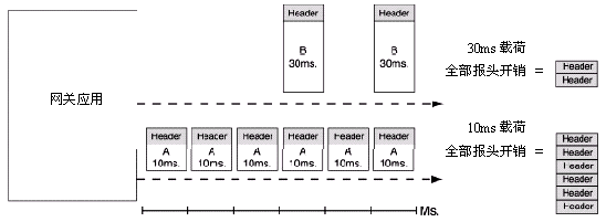 在一個(gè)減少發(fā)話方和受話方間音頻反應(yīng)時(shí)間的努力中,VoIP網(wǎng)關(guān)通常會(huì)配置成發(fā)送較小的語(yǔ)音數(shù)據(jù)載荷。雖然這樣做通?梢詼p少聽(tīng)得見(jiàn)的傳輸延遲,但同時(shí)也增加了一個(gè)給定語(yǔ)音數(shù)據(jù)流需要傳遞的包的數(shù)量。因?yàn)椴还芏嘈〉囊纛l載荷都需要一個(gè)固定大小的包報(bào)頭,網(wǎng)上需要傳遞的數(shù)據(jù)量越大這個(gè)效果越明顯──跟隨的是網(wǎng)絡(luò)包和數(shù)據(jù)流量的相應(yīng)增長(zhǎng)。圖1說(shuō)明了用于傳輸包報(bào)頭的帶寬會(huì)隨著包載荷大小的縮小而增大。