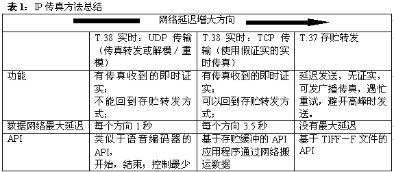 IP傳真方法的一個總結顯示于表1之中。通過選擇功能、業(yè)務需求以及所用網絡的延遲,就能得出最適合指定應用的傳真方法。
