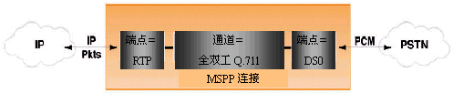 MSPP通道可以是全雙工語(yǔ)音編碼器、傳真轉(zhuǎn)發(fā)編碼器、或者是各種單工通道。在一個(gè)普通VoIP網(wǎng)關(guān)應(yīng)用中,一個(gè)端點(diǎn)就是一個(gè)和PSTN連接的DS0,PSTN連接最常見(jiàn)的是CG6000系列平臺(tái)上的T1或E1接口,也可能是T3接口。其它連接是一個(gè)通過(guò)以太網(wǎng)接口連接到廣域包網(wǎng)絡(luò)(WAN)的RTP話音包端口。通過(guò)指定端點(diǎn)和通道類型,很容易開(kāi)發(fā)出各種包電話應(yīng)用。
