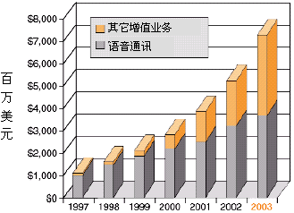 為了獲得競(jìng)爭(zhēng)優(yōu)勢(shì),業(yè)務(wù)提供商──傳統(tǒng)長(zhǎng)途運(yùn)營(yíng)和本地交換運(yùn)營(yíng)商,因特網(wǎng)業(yè)務(wù)提供商(ISP),應(yīng)用業(yè)務(wù)提供商,以及無線運(yùn)營(yíng)商──都在想方設(shè)法發(fā)布基于IP的業(yè)務(wù),這些業(yè)務(wù)應(yīng)該:對(duì)用戶有較高的價(jià)值,能縮短面市所需時(shí)間,部署是低成本高效益的。向用戶提供高價(jià)值的增值業(yè)務(wù)能為業(yè)務(wù)提供商帶來重要的收入源泉,并使他們更有特色,增加市場(chǎng)分額,特別是如果這些業(yè)務(wù)以快速、易于支持的方式部署,以上這些優(yōu)勢(shì)就會(huì)更加突出。據(jù)估計(jì),到2003年增值業(yè)務(wù)設(shè)備僅在美國(guó)就能達(dá)到73億美元的市場(chǎng),正如圖1所示。