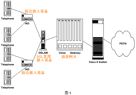 圖4給出了BLES的邏輯結(jié)構(gòu)。這種方式下,VoDSL廠商必須設(shè)計(jì)開發(fā)用于和已有的用戶設(shè)備、DSL網(wǎng)絡(luò)及Class 5交換機(jī)互通的接口設(shè)備;用戶側(cè)設(shè)備IAD為數(shù)據(jù)傳輸提供了Ethernet和ATM接口,為話音傳送提供了一定數(shù)量的模擬用戶線接口,每一接口都被分配了唯一的DSL電路。話音網(wǎng)關(guān)和Class 5交換機(jī)間的接口協(xié)議,在美國(guó)等地區(qū)采用GR-303和TR-08標(biāo)準(zhǔn),而在歐洲標(biāo)準(zhǔn)中使用V5.2接口。參見(jiàn)后面的圖6。