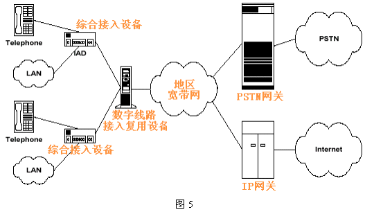 這種方式又稱為VoMBN/VoMSBN(Voice over Multi-service Broadband Network)。圖5給出了MSDN的邏輯結(jié)構(gòu)這種方式下,DSL本地環(huán)路和PSTN及Internet間的互聯(lián)不再通過(guò)Class 5交換機(jī),而由地區(qū)寬帶多業(yè)務(wù)網(wǎng)絡(luò)代替,從用戶側(cè)看仍和Class 5 交換機(jī)等效,當(dāng)其功能復(fù)雜得多。這個(gè)網(wǎng)絡(luò)可以是基于IP或ATM的,它包含信令系統(tǒng)和呼叫處理服務(wù)器及各種網(wǎng)關(guān)設(shè)備。