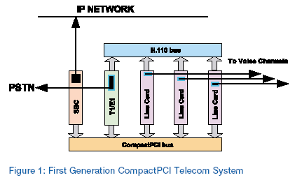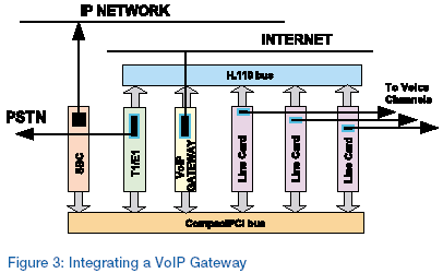 其它新業(yè)務(wù),例如IP話音(VoIP),如果要達(dá)到理想的性能,就需要電信系統(tǒng)內(nèi)部的集成,增加一塊網(wǎng)關(guān)板卡,作為附屬在CompactPCI總線和H.110總線上的外圍設(shè)備,F(xiàn)在,有了額外硬件(網(wǎng)關(guān)板卡)和VoIP的額外軟件,充分利用VoIP性能就成為可能(圖3)。