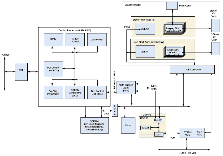 每個(gè)板卡包括三個(gè) Motorola 563xx DSP. DSP 子系統(tǒng)包括SRAM, 某些情況下有DRAM. DSPs 直接有PCM連接到CTbus ASIC, 它提供SCbus/CTbus(H.100)和模擬座席接口之間PCM交換的功能.