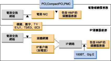 模塊化的下一代網(wǎng)絡(luò)將語音和數(shù)據(jù)合并在單個包基礎(chǔ)結(jié)構(gòu)中。這使目前的兩種主要架構(gòu)可用于部署媒體服務(wù);基于直通電路的網(wǎng)絡(luò)接口和基于包的IP網(wǎng)絡(luò)接口。下面的圖說明了這兩種架構(gòu)。Dialogic HMP軟件可在這兩種架構(gòu)中提供媒體處理。