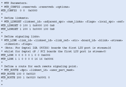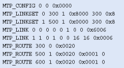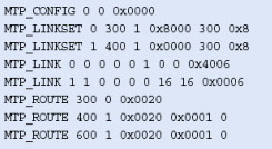 注意,這些不包括任何設(shè)置或定義信令板卡的命令,應(yīng)該象定義標(biāo)準(zhǔn)的單系統(tǒng)一樣定義。MTP_ROUTE <up_enable>參數(shù)為ISUP設(shè)置,在上例中用戶部分SI=5。